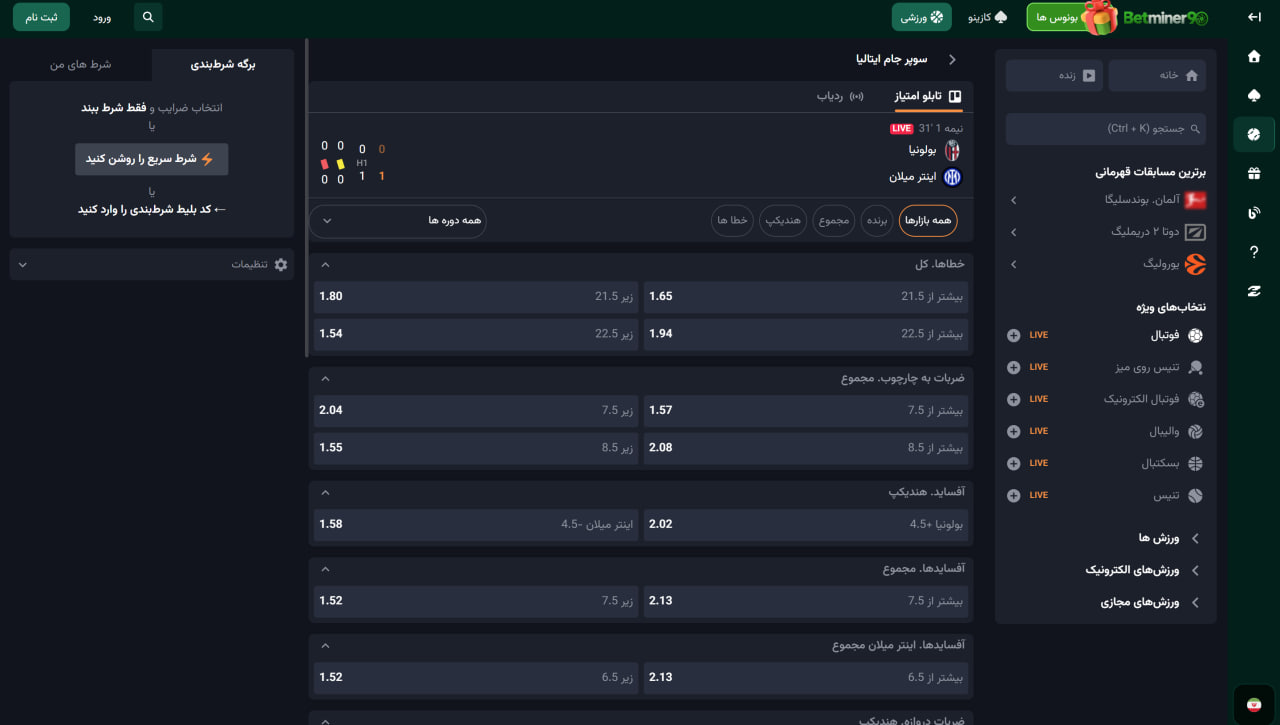 آپشن های ورزشی بت ماینر