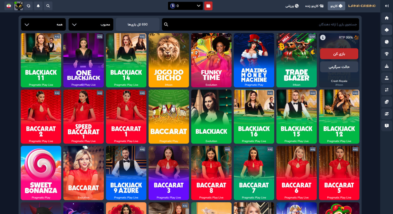 سایت لانا کازینو در قسمت بازی‌های کازینو بازی‌هایی از جمله انفجار ، بلک جک ، باکارات و غیره را قرار داده است.